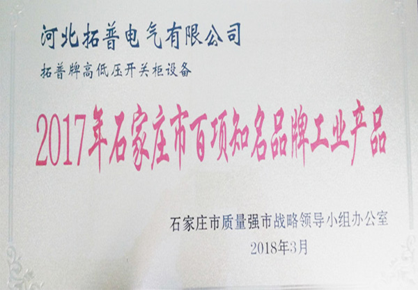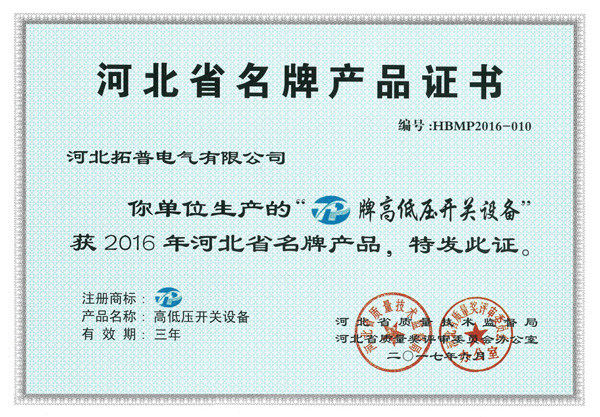 "TP牌高低壓開關(guān)設(shè)備”被評定為河北省名牌產(chǎn)品