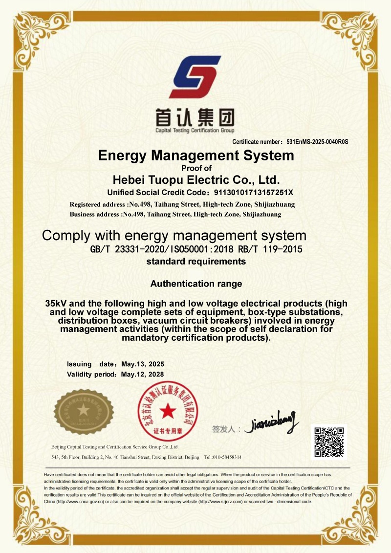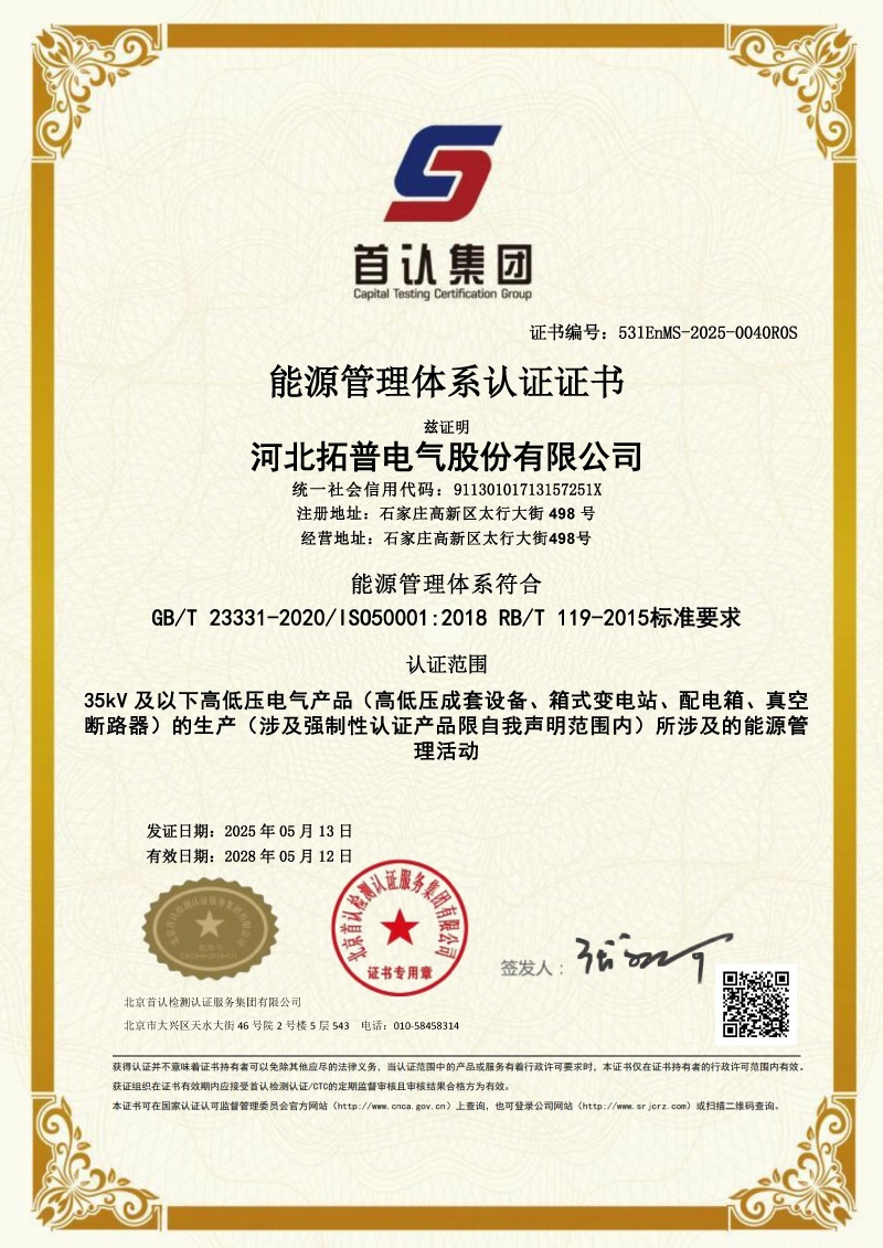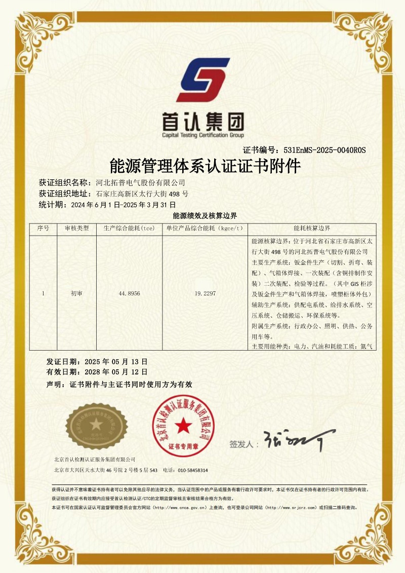 近日,我司—— 河北拓普電氣股份有限公司憑借完善的能源管理體系建設(shè)、卓越的能源管控能力以及全員參與的節(jié)能降耗實踐,順利通過北京首認檢測認證服務(wù)集團有限公司的嚴格審核,正式獲得能源管理體系認證證書!這一認證的取得,標(biāo)志著我司在能源管理標(biāo)準(zhǔn)化、規(guī)范化、系統(tǒng)化建設(shè)方面邁出了堅實一步,更是我司踐行綠色發(fā)展理念、推動可持續(xù)發(fā)展的重要里程碑!