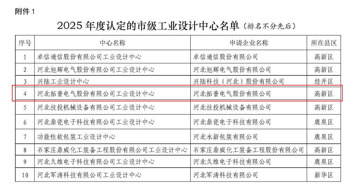 喜報!河北拓普電氣榮獲“石家莊市級工業(yè)設(shè)計(jì)中心”稱號